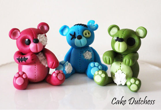 Today I have a guest post from the very talented Naera from Cake Dutchess. She has taken adorable little teddy bears and turned them into zombies for Halloween. These fondant toppers would look great on a cake in a group, or individually on halloween cupcakes.