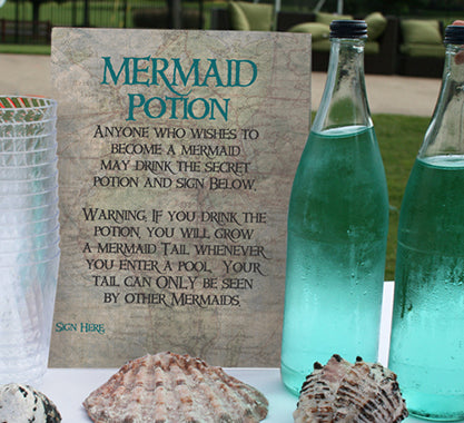 I thew a mermaid party for my youngest daughter, which you can read about in an earlier blog post, and I’ve gotten a ton of questions about the mermaid potion. (And thousands of repins on Pinterest.) You can read below how the game worked, how we made the potion, and most importantly, download the sign for free!