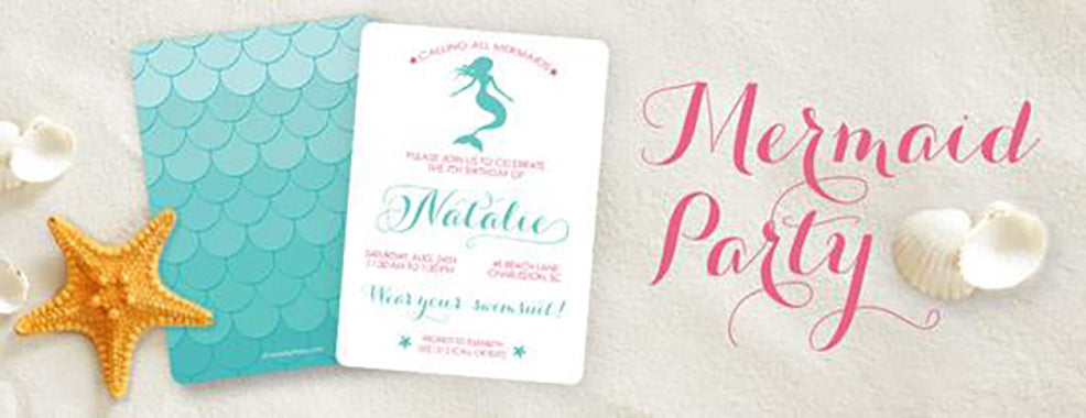 The invitations, shown above, featured an ombre mermaid scale pattern on the back and had aqua and honeysuckle on the front. The invitations are available here.
