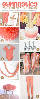 I have three kids, and at one point or another I’ve thrown each of them a gymnastics party. Combine that with all of the gymnastics parties we’ve been invited to, and you have a very well-used party theme. Typical gymnastics parties are either pink (for girls) or primary colors (for boys), so I decided to take a fresh spin on things and design party in a coral and melon color scheme. The inspiration is still “young and fun”, but it has a touch of sophistication that’s sure to please Mom, too. Be sure to follow my Gymnastics Inspiration Board on Pinterest – I’ll be adding fresh new ideas as I find them.