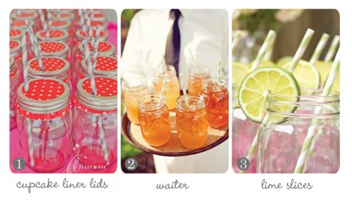 SOURCES: 1) Strawberry party by The Amber Image; 2) waiter and tray The Jetset Prepster; 3) lime slices and paper straws The Estate of Things; 4) Baby Bird Sprinkle Kara’s Party Ideas; 5) Make-ahead frozen mason jar margaritas The Yummy Life; 6) Iced tub lemonade Yummy Wedding Food. And the common theme: vintage-style paper straws!