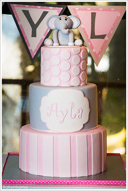 With a sweet grey elephant on top who says, “Happy Birthday sweet Ayla!”