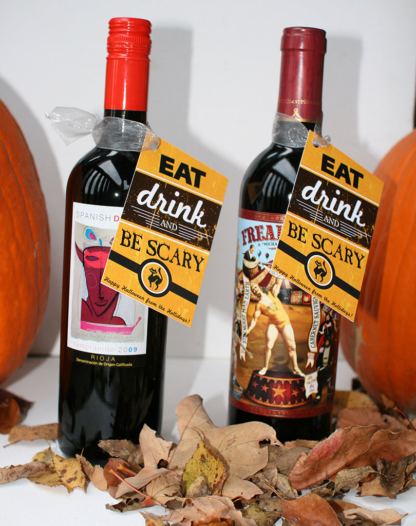 I went with the “eat, drink, and be merry” Christmas theme, but switched it to “eat, drink and be scary” Halloween theme. I loved these labels so much, I also created a printable wine bottle label to match. You can either print out the gift tags (and print on cardstock /attach with ribbon) or the wine bottle labels (print on paper / attach with double sided tape). Either way, happy haunting!