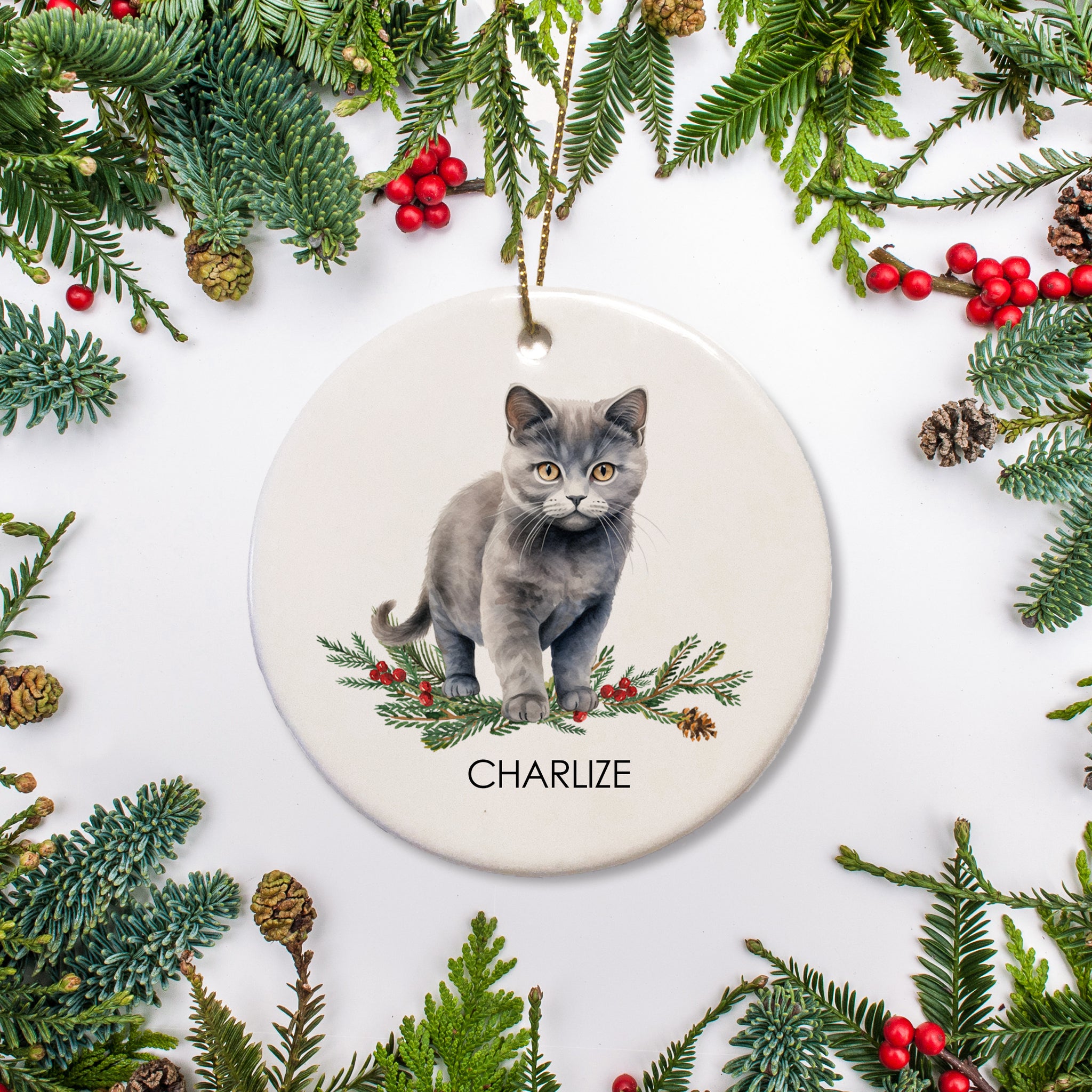 This personalized ornament features a sweet Chartreux cat, along with the name of your choice. It is a lovely gift for any cat lover or way to commemorate your fur baby's first Christmas.