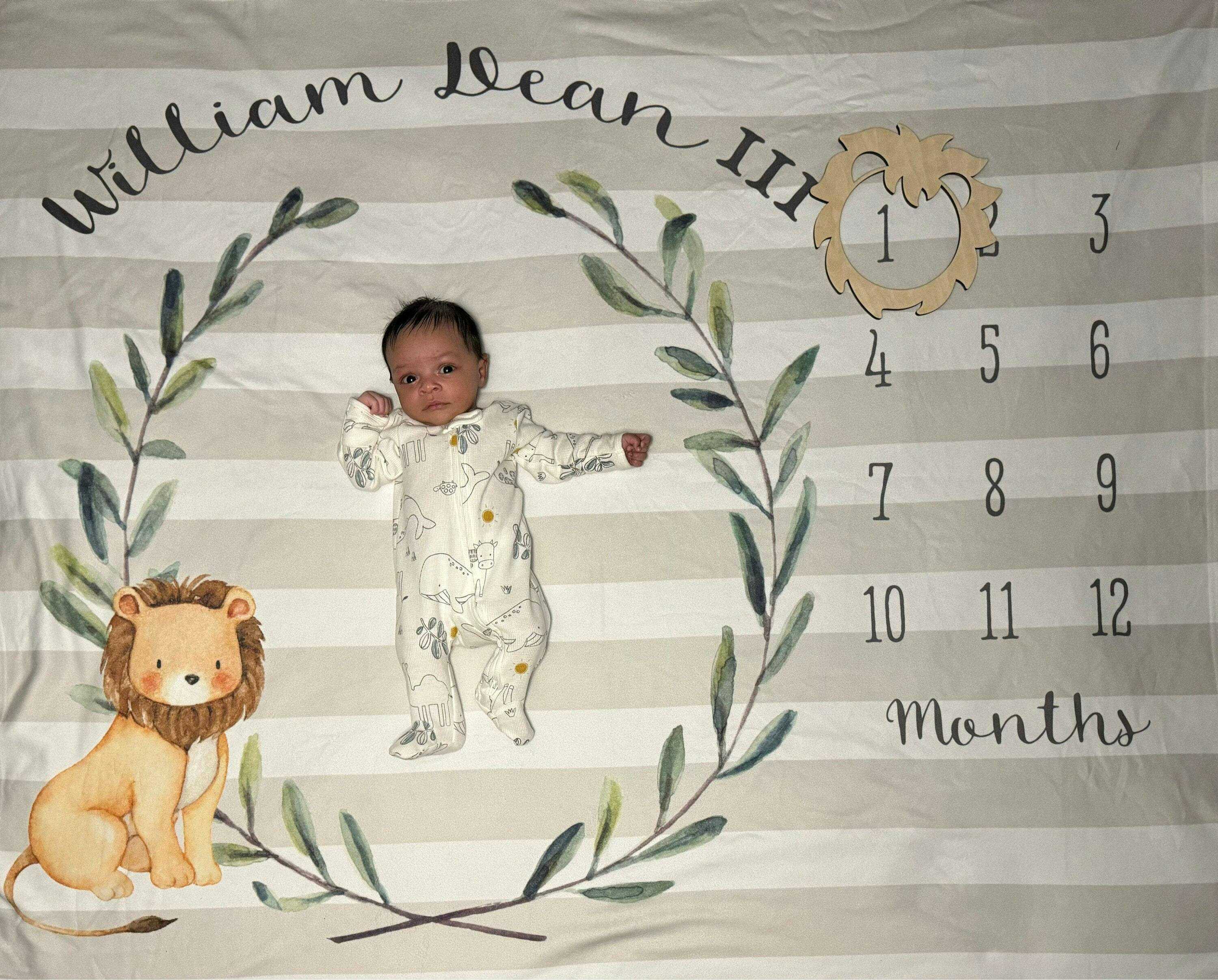 This cozy lion personalized baby milestone blanket helps track your baby's age and growth.