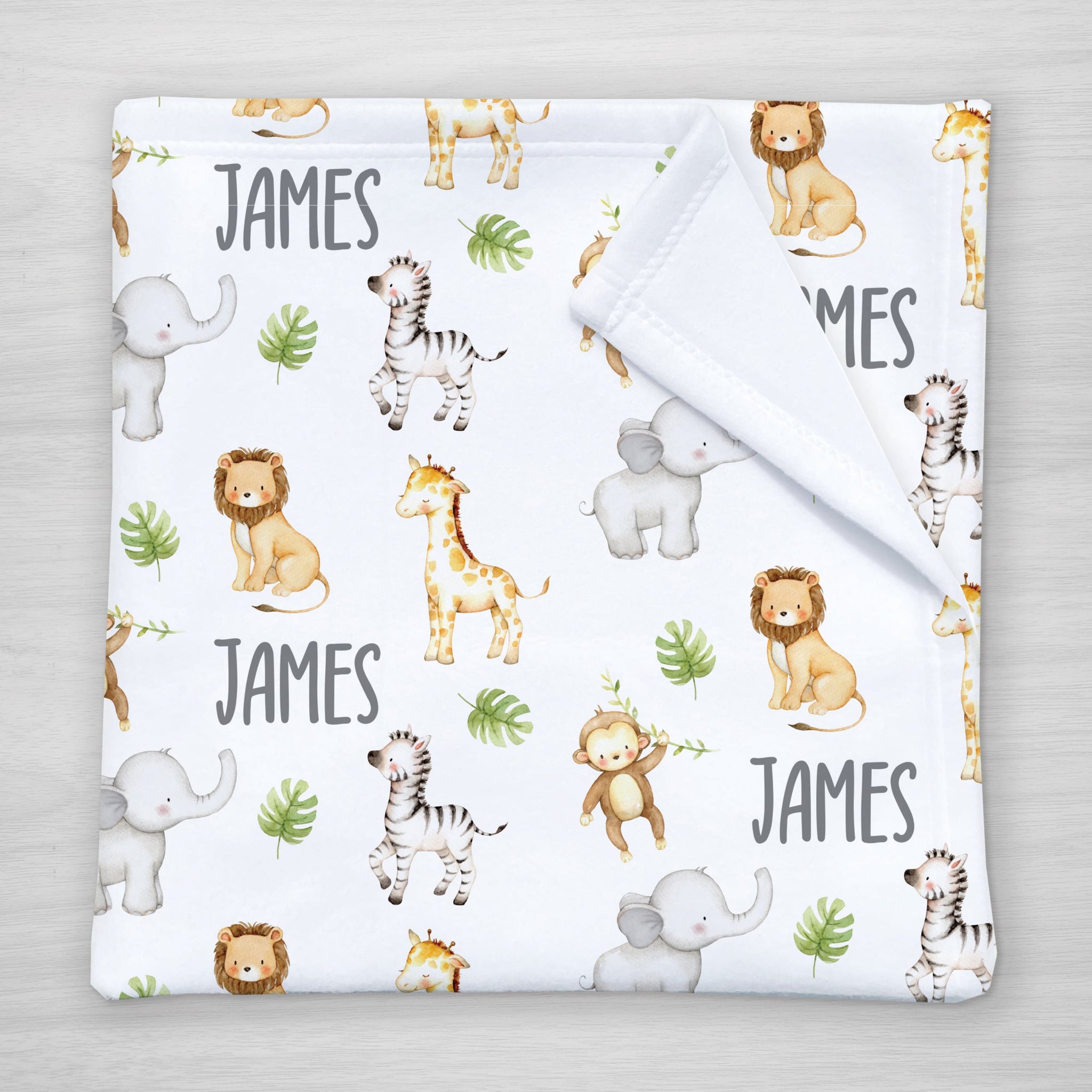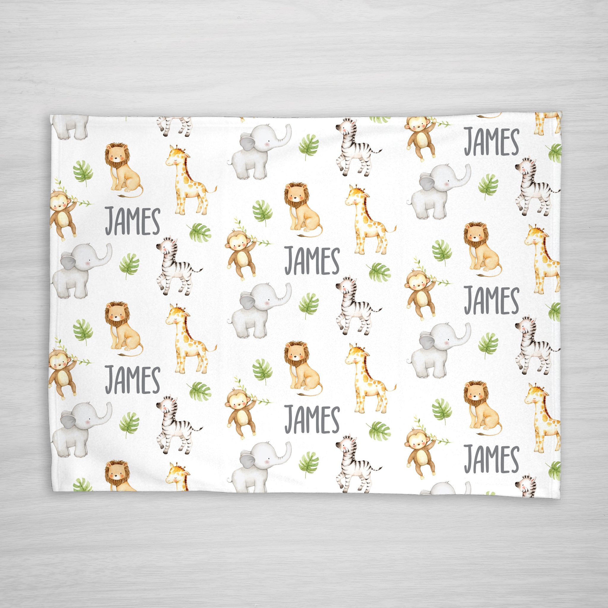 Our fun safari animals blanket is personalized with your little one's name. Choose a smaller size for a stroller blanket, or one of our huge sherpa blankets for a snuggle blanket that will be loved for years. Featuring an elephant, zebra, giraffe, and lion.